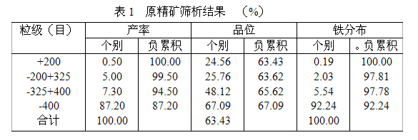 1) 现场原精矿品位62.85 %,粒度- 200目99.5 %,- 325目94.5 %,- 400目87.2 %,应该说该精矿粒度微细。原精筛析表明,+ 400目、+ 325目、+ 200目三个粒级品位均低,在48.12 % ~ 24.56 %之间,是影响精矿品位的主要因素。原因是常规磁选磁团聚的裹携及磨矿粒度微细矿浆粘度大,使单体脉石不能充分分出所致。