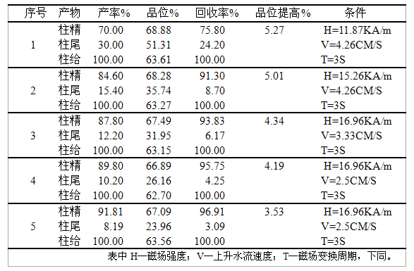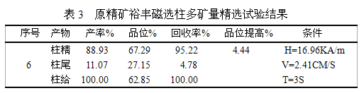 在条件试验之后进行了较佳条件的磁选柱精选司家营选厂所送低品位精矿的试验,结果见表3。