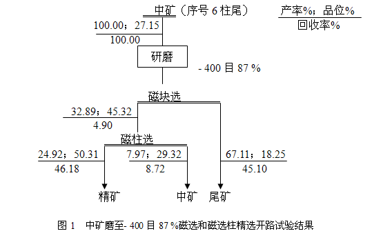 生产中中矿经浓缩磁选,浓磁精矿直接返至二次球磨机,形成中矿闭路磨选,只用一段磁选柱精选即可。