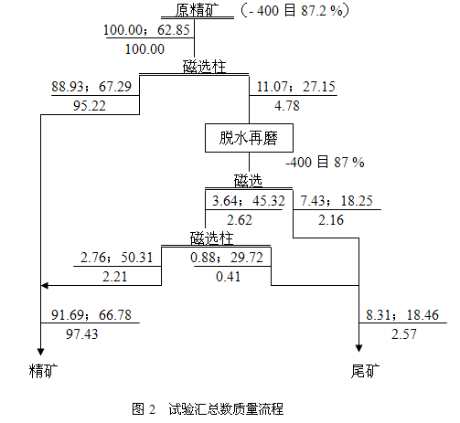 该数质量流程是分段试验小型试验组合数质量流程,生产中磁选柱中矿(柱尾)是经浓缩磁选后返至二次磨矿的闭路磨选流程,整个过程只用一段磁选柱精选。