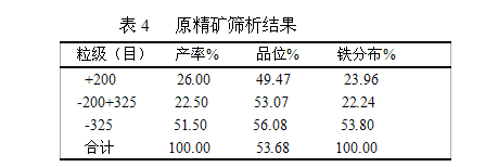 该选厂处理的矿石属低钒钛磁铁矿石。所取试验矿样为低品位精矿,TFe品位为53.20%,其筛析结果见表4。