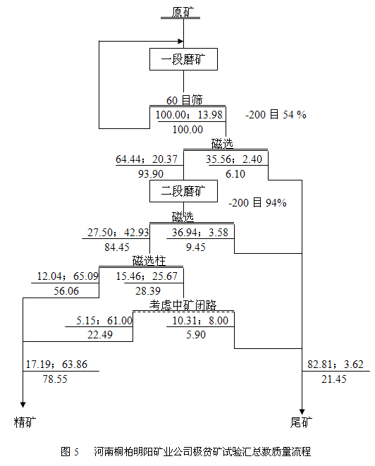 对河南桐柏明阳矿业公司极贫磁铁矿石进行破碎,磨矿磁选和磁选柱精选。根据分段分选所取得的试验结果,将试验汇总成如图5数质量流程。